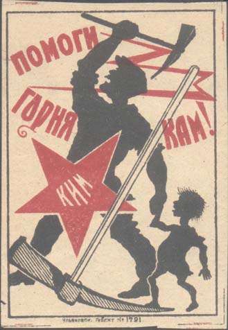 1926 1926 г. Разм. 55 х 80 мм. Двухцветная печать на желтоватой бумаге. В прямоугольной рамке разм. 50 х 74 мм на переднем плане пятиконечная звезда с аббревиатурой «КИМ» и кирка. На заднем плане силуэт шахтера с киркой, держащего за руку ребенка. Текст в две строки: «Помоги горнякам». Внизу под рамкой мелким шрифтом выходные данные: «Ульяновск, Гублит №1721». По углам знака разграничительные линии.