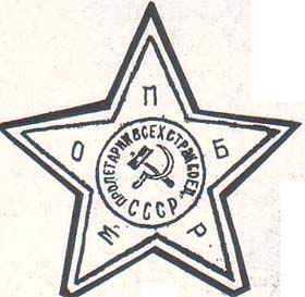 1923 1923 г. Виньетка в форме пятиконечной звезды разм. 48 x 44 мм. Одноцветная печать на желтоватой бумаге. В рамке в форме пятиконечной звезды в центре в круглой рамке серп и молот. По внутреннему периметру круглой рамки текст: «СССР. Пролетарии всех стран, соед[иняйтесь].». В лучах звезды буквы аббревиатуры «М.0.П.Б.Р.