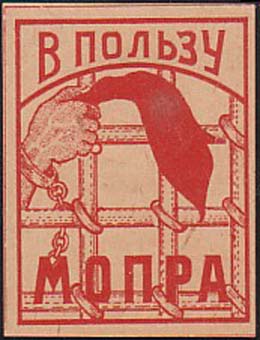 1931 1931 г. 17.03.1931 г. Разм. 42 х 56 мм. Одноцветная печать на бумаге различных цветов. В прямоугольной рамке разм. 39 х 51 мм изображение руки узника в кандалах и с платком в окне с решет-кой. Сверху текст: «В пользу». Внизу продолжение текста: «МОПРА».