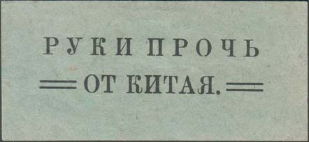 1930 1930(?) г. Разм. 75 х 35 мм. Одноцветная печать на тонкой серо-зеленой бумаге. В центре текст в две строки: «Руки прочь от Китая».