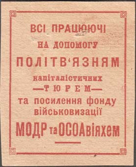 1930 1930(?) г. Разм. 46 х 57 мм. Одноцветная печать на тол-стой желтоватой бумаге. В прямоугольной рамке разм. 40 х 49 мм с декоративными элементами по углам в центре текст в восемь строк на украинском языке: «Все трудящиеся на помощь политзаключенным капиталистических тюрем и усиление фонда военизации. МОПР и ОСО-АВИАХИМ».