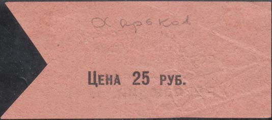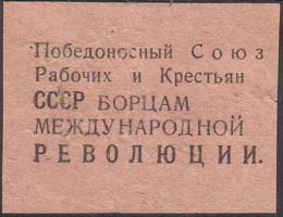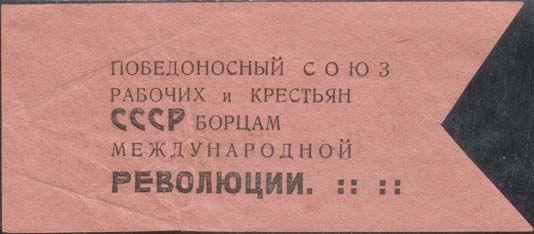 1923 1923 г. Виньетка в форме флажка. Одноцветная двух-сторонняя печать на желтоватой бумаге. На лицевой стороне текст в пять строк: «Победоносный Союз Рабочих и Крестьян СССР борцам международной революции». На обороте текст: «Цена ... руб.».