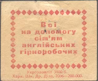 1926 1926 г. 03.09.1926 г. Разм. 54 х 47 мм. Одноцветная печать на светло-бежевой бумаге. В прямоугольной рамке из ромбиков разм. 32 х 41 мм текст в пять строк на украинском языке: «Все на помощь семьям английских горнорабочих». Внизу под рамкой выходные данные мелким шрифтом в две строки: «Укрглавлит 3800/6. Харк. Шк. Печ. Дела 2096-200.000».