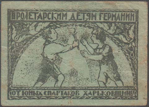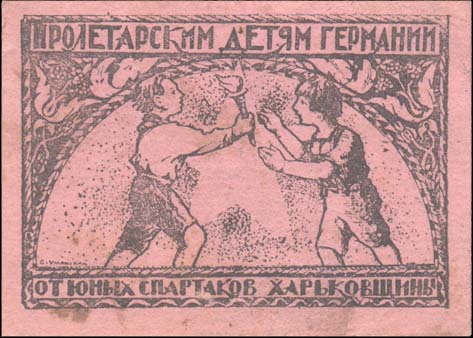 1926 1926(?) г. Разм. 84 х 61 мм. Одноцветная печать на бумаге различных цветов. В прямоугольной декоративной рамке разм. 71,5 х 49,5 мм на фоне пятиконечной звезды один ребенок передает факел другому. Сверху текст: «Пролетарским детям Германии». Внизу продолжение текста: «От юных Спартаков Харьковщины». В левом нижнем углу текст мелким шрифтом: «С. Уманский».