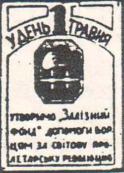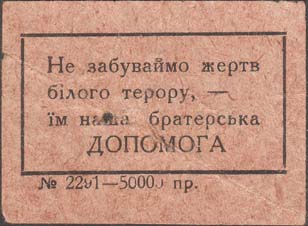 1930 1930(?) г. Разм. 52 х 37 мм. Одноцветная печать на желтовато-серой бумаге низкого качества. В прямоугольной рамке разм. 45 х 24 мм текст в четыре строки на украинском языке: «Не забудем жертв белого террора, - им наша братская помощь». Внизу под рамкой мелким шрифтом выходные данные на украинском языке: «№2291 – 5000 шт.».
