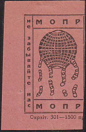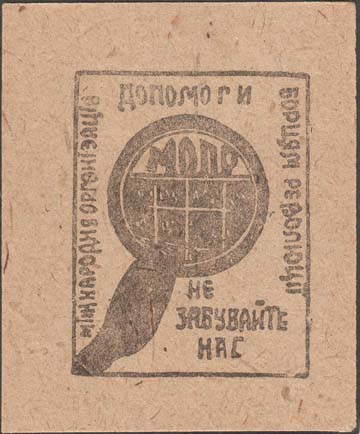 1930 1930(?) г. Разм. 60 х 72 мм. Одноцветная печать на желтовато-серой бумаге низкого качества. В прямоугольной рамке разм. 40 х 50 мм в центре стилизованная эмблема МОПР в круглой рамке. По внутреннему периметру рамки текст на украинском языке: «Международная организация помощи борцам революции». В правом нижнем углу текст в три строки: «Не забывайте нас».