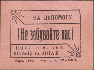 1930 1930(?) г. Разм. 60 х 45 мм. Одноцветная печать на розово-серой бумаге. В прямоугольной декоративной рамке разм. 55 х 30 мм в центре текст на украинском языке: «!Не забывайте нас!». Сверху текст на украинском языке: «На помощь». Внизу продолжение текста в две строки на украинском языке: «Политзаключенным Польши и Китая». Внизу под рамкой мелким шрифтом выходные данные: «Окрл. 0560. 3-я тип. 3. 852- 100 т.».