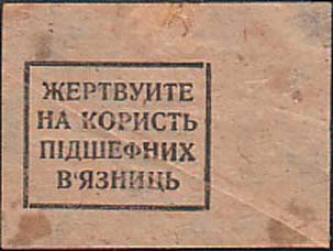 1930 1930(?) г. Разм. 51 х 37 мм. Одноцветная печать тонкой сероватой бумаге низкого качества. В центре в прямоугольной рамке разм. 29 х 22 мм текст на украинском языке: «Жертвуйте в помощь подшефных тюрем».