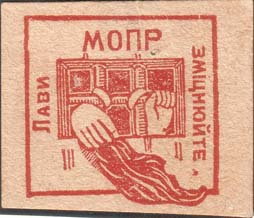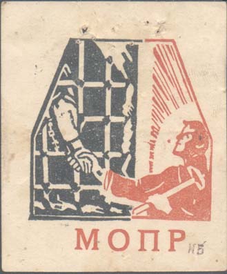 1930 1930(?) г. Разм. 55 х 66 мм. Двухцветная печать на бумаге различных цветов. В центре эмблема МОПР. Внизу аббревиатура «МОПР».