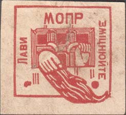 1930 1930(?) г. Разм. 52 х 74 мм. Одноцветная печать на желтоватой бумаге. В центре эмблема МОПР. Внизу текст в четыре строки на украинском языке: «Все на помощь политзаключенным капиталистических стран».