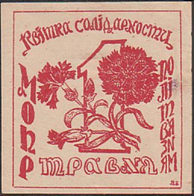 1930 1930(?) г. Разм. 74 х 74 мм. Одноцветная печать на желтоватой бумаге. В центре в прямоугольной рамке разм. 58 х 58 мм три гвоздики и текст в две строки на украинском языке: «1 мая». По периметру текст на украинском языке: «МОПР. День солидарности с политзаключенными».