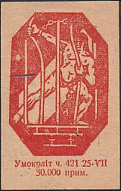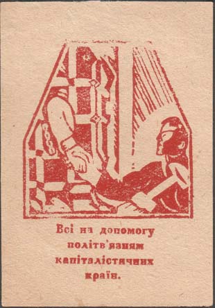 1930 1930(?) г. Разм. 40 х 63 мм. Одноцветная печать на желтоватой бумаге. В центре в восьмиугольной рамке аллегорический рисунок: заключенный разгибает прутья тюремной решетки. Внизу выходные данные мелким шрифтом на украинском языке.