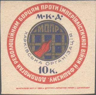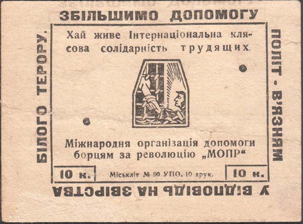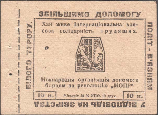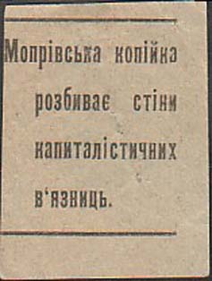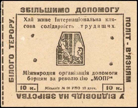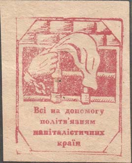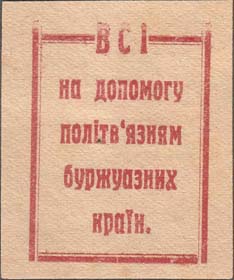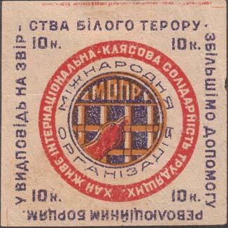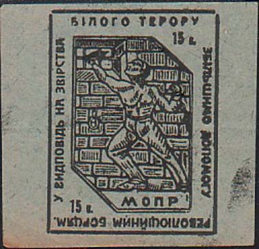 1930 1930(?) г. Разм. 63 х 60 мм. Одноцветная печать на серо-синеватой бумаге низкого качества. В центре в прямоугольной рамке разм. 42 х 55 мм аллегорический рисунок: узник, тянущийся к окну с решеткой. Внизу аббревиатура «МОПР». В правом верхнем и левом нижнем углах номинал. По внутреннему периметру рамки текст на украинском языке: «В ответ на зверства белого террора усилим помощь революционным борцам».