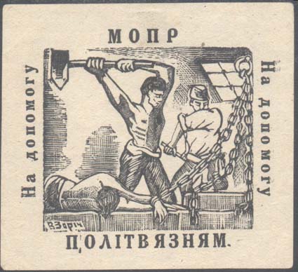 1930 1930(?) г. Разм. 70 х 64 мм. Одноцветная печать на бумаге различных цветов. В центре двое рабочих освобождают от кандалов узника. По периметру текст на украинском языке: «На помощь МОПР. На помощь политзаключенным». В левом нижнем углу рисунка мелким шрифтом текст: «В.Зорич».