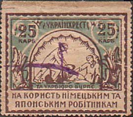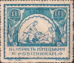 1925 1925 г. Разм. рамки 44 х 37 мм. Двухцветная печать на желтоватой бумаге. С клеем. В двойной прямоугольной декоративной рамке в центре полукруглая рамка, в которой на фоне индустриального пейзажа крестьянин протягивает буханку хлеба сидящему рабочему. Слева и справа растительный орнамент. Сверху в центре текст на украинском языке: «Украинкрест». В верхних углах номинал. Внизу текст на украинском языке в две строки: «В помощь немецким и японским рабочим». Внизу под рамкой мелким шрифтом выходные данные: «Лит. Техн. ин-та Харьков».