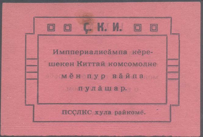 1926 1926(?) г. Листок разм 110 х 74 мм. Одноцветная двухсторонняя печать на плотной розовой бумаге. На лицевой стороне в двойной прямоугольной декоративной рамке разм. 85 х 58 мм текст в четыре строки: «Окажем посильную помощь китайскому Комсомолу в его трудной борьбе с империализмом». Сверху между рамками аббревиатура «К.И.М.». Внизу между рамками текст: «Чебгоррайком ВЛКСМ». На оборотной стороне в такой же рамке тот же текст на чувашском языке.
