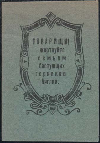 1926 1926 г. 13.08.1926 г. Разм. 55 х 79 мм. Одноцветная печать на плот-ной серо-зеленоватой бумаге. В центре в рамке сложной формы текст в шесть строк: «Товарищи! жертвуйте семьям бастующих горняков Англии».