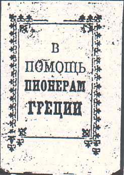 1930 1930(?) г. Разм. 35 x 50 мм. Одноцветная печать на желтоватой бумаге. В прямоугольной декоративной рамке разм. 22 x 33 мм в центре текст в четыре строки: «В помощь пионерам Греции».