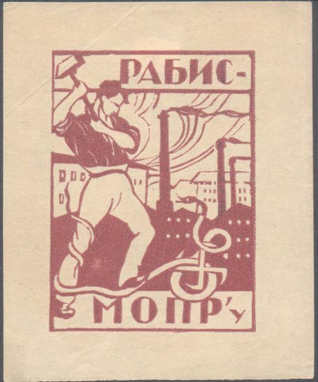 1930 1930(?) г. Разм. 75 х 91 мм. Одноцветная печать на кремовой бумаге. В центре в прямоугольной рамке разм. 49 х 68 мм аллегорический рисунок: на фоне индустриального пейзажа рабочий бьет молотом змею, обвивающую свастику и ногу рабочего. Текст: «РАБИС - МОПРу».