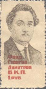 1930 1930(?) г. Разм. по перфорации 25 х 48 мм. Двухцветная печать на кремовой бумаге. Нерегулярная зубц. В центре портрет Г. Димитрова. Ниже текст пять строк: «Фонд Георгия Димитров Б.К.П. 1 руб.».