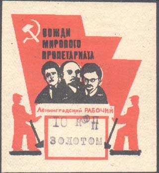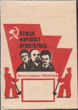 1930 1930(?) г. Разм. 53 х 59 мм. Двухцветная печать на белой бумаге. В центре на фоне красных знамен портреты Л.Троцкого, Г.Зиновьева и Л.Каменева. На знамени сверху текст: «Вожди мирового пролетариата». Внизу текст: «Ленинградский рабочий». Внизу прямоугольная рамка, слева и справа рабочие с лопатами.