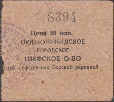 1932 1932 г. Листок из квитанционной книжки разм. 66 х 58 мм. Одноцветная печать на серо-голубой бумаге низкого качества. Левосторонняя нерегулярная просечка. В центре текст в четыре строки: «Орджоникидское городское шефское о-во по шефству над Горской деревней». Сверху номер нумератором и номинал: «Цена 30 коп.». Слева вертикальная пунктирная разделительная линия. На лицевой стороне слева фрагмент фиолетового оттиска круглой контрольной печати диаметром 37 мм.