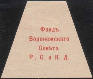 1917 1917 г. Виньетка в форме трапеции разм. 53 х 44 мм. Одноцветная печать на желтоватой бумаге. В центре текст в четыре строки: «Фонд Воронежского Совета Р.,С. и К.Д.».