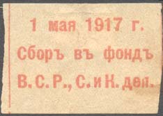 1917 1917 г. 01.05.1917 г. Разм. 37 х 27 мм. Одноцветная печать на тонкой желтоватой бумаге. В центре текст в три строки: «1 мая 1917 г. Сбор в фонд В.С. Р,С. и К. деп[утатов].». Сверху разграничительная линия.