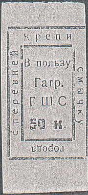 1932 1932 г. Разм. 26 х 54 мм. Одноцветная печать на серой бумаге. В двойной прямоугольной рамке разм. 22,5 х 37,5 мм сверху текст в две строки: «В пользу Гагр[инского]. Г.Ш.С.». Внизу номинал. По периметру между рамками текст: «Крепи смычку города с деревней».