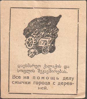 1932 1932(?) г. Разм. 50 х 58 мм. Одноцветная печать желтоватой бумаге. В прямоугольной рамке разм. 40 х 50,5 мм в центре эмблема общества смычки: трактор на фоне знамени. Внизу текст в пять строк, на русском и грузинском языках: «Все на помощь делу смычки города с дерев-ней».