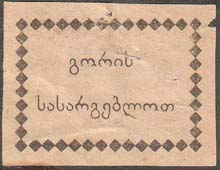 1925 1925(?) г. Разм. 36 х 28 мм. Одноцветная печать на желтоватой бумаге. В центре в прямоугольной рамке разм. 31 х 22 мм текст в две строки на грузинском языке: «В пользу г. Гори».