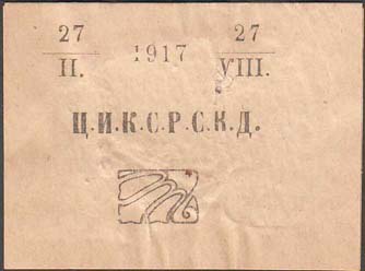 1917 1917 г. 27.II. – 27.III.1917 г. Разм. 55 х 41 мм. Одноцветная печать на тонкой желтоватой бумаге. В центре аббревиатура: «Ц.И.К.С.Р.С.К.Д.». Сверху дата: «27/II – 27/III». Внизу декоративный элемент.