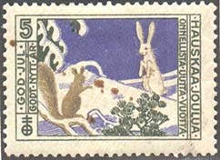 1912 1912 г. Разм. рамки 34,5 х 22,5 мм. Трехцветная печать на белой бумаге. Зубц. 11 1/2. С клеем. Белка и заяц в зимнем лесу. Слева и справа вертикально тексты на финском и других сканди-навских языках: «Счастливого Рождества». В левом верхнем углу номинал.