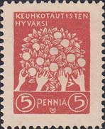 1908 1908 г. Разм. рис. 18 х 24,5 мм. Одноцветная печать на белой бумаге. Зубц. 11 1/2. С клеем. Две пары рук, протянутые к дереву с плодами. Сверху текст в две строки на финском языке.