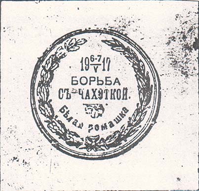 1917 1917 г. 06.-07.05.1917 г. 07.05.1917 г.). Разм. 68 х 68 мм. Одноцветная печать на бумаге различных цветов. В центре в тройной круглой рамке диаметром 44 мм в обрамлении венка в центре текст в три строки: «19 6-7/V 17 Борьба с чахоткой». Ниже декоративный элемент и текст: «Белая ромашка».