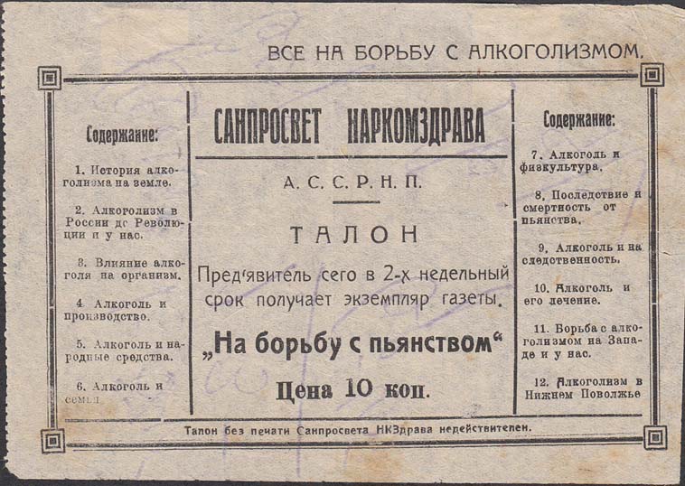 1934 1934 г. Квитанция разм. 130 х 90 мм. Одноцветная печать на тонкой светло-серой бумаге. Левосторонняя зубц. 11 1/2. В тройной прямоугольной декоративной рамке разм. 115 х 79 мм в центре текст в семь строк: «Санпросвет Наркомздрава А.С.С.Р.Н.П. Талон. Предъявитель сего в 2-х недельный срок получает экземпляр газеты «На борьбу с пьянством». Цена 10 к. Слева и справа краткое содержание газеты». Сверху справа над рамкой текст: «Все на борьбу с алкоголизмом». Внизу с внутренней стороны рамки текст: «Талон без печати Санпросовета Наркомздрава недействителен».