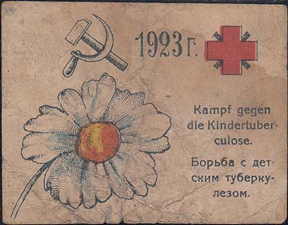 1923 1923 г. Разм. 71 х 54 мм. Многоцветная печать на светло-желтой бумаге. В центре слева цветок ромашки. Справа текст в три строки на немецком и русском языках: «Борьба с детским туберкулезом». Сверху дата: «1923 г.», серп и молот и красный крест.