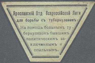 1917 1917(?) г. Виньетка в форме перевернутой трапеции разм. 63 х 41 мм. Одноцветная печать на серо-зеленоватой бумаге. В двойной рамке в форме перевернутой трапеции разм. 54 х 35,5 мм текст в семь строк: «Ярославский Отд[ел]. Всероссийской Лиги для борьбы с туберкулезом. На помощь больным туберкулезом бывшим политическим заключенным и ссыльным».
