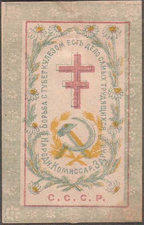 1928 1928(?) г. Разм. 70 х 92 мм. Многоцветная печать на белой бумаге. В прямоугольной рамке разм. 36 х 63 мм с декоративными полями в обрамлении венка из ромашек Лотарингский крест. Внизу серп и молот в обрамлении венка из колосьев пшеницы. По внутреннему периметру венка из ромашек текст: «Борьба с туберкулезом есть дело самих трудящихся. Народн[ый]. Комиссар[иат]. Здрав[охранения].». Внизу аббревиатура «С.С.С.Р.».
