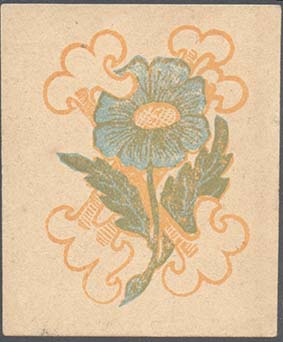 1915 1915(?) г. Разм. рис. 47 х 57 мм. Трехцветная печать на желтоватой бумаге. В центре на фоне монограммы(?) цветок ромашки со стеблем и двумя листьями.