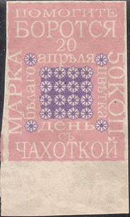 1917 1917(?) г. Разм. рис. 28 х 38 мм. Двухцветная печать на белой бумаге. В центре на сплошном фоне геометрический орнамент из стилизованных цветков ромашки. По наружному периметру орнамента текст: «20 апреля день Белого Цветка». Сверху текст в две строки: «Помогите бороться». Внизу продолжение текста в две строки: «С чахоткой». Слева вертикально текст: «Марка». Справа вертикально номинал: «50 коп.».