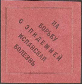 1920 1920(?) г. Ромб разм. 66 х 66 мм. Одноцветная печать на красной бумаге. В центре в двойной рамке в форме ромба разм. 55 х 55 мм текст в пять строк: «На борьбу с эпидемией. Испанская болезнь».