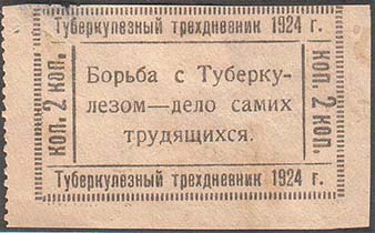 1924 1924 г. Листок из квитанционной книжки разм. рамки 40 х 29 мм. Одноцветная печать на желтоватой бумаге. Левосторонняя нерегулярная зубц. В двойной прямоугольной рамке текст в три строки: «Борьба с Туберкулезом – дело самих трудящихся». Сверху и снизу между рамками текст: «Туберкулезный трехдневник 1924 г.». Слева и справа между рамками номинал.