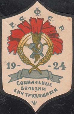 1924 1924 г. Виньетка в виде щитка сложной формы разм. 40 х 62 мм. Трехцветная печать на толстой белой бумаге. В центре серп и молот в обрамлении венка из гвоздик и колосьев пшеницы. Внизу лента и дата: «1924». Сверху аббревиатура «Р.С.Ф.С.Р.». Внизу текст в три строки: «Социальные болезни - бич трудящихся». Внизу декоративный элемент.