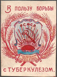 1924 1924 г. Разм. 45 х 54 мм. Трехцветная печать на толстой белой бумаге. В центре герб РСФСР. Сверху текст: «В пользу борьбы». Внизу продолжение теста: «С туберкулезом».