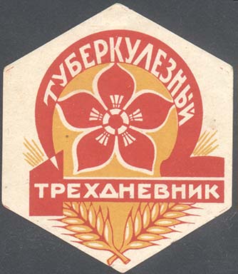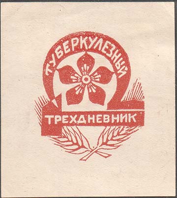1925 1925(?) г. Разм. 60 х 66 мм. Одноцветная печать на белой бумаге. В центре стилизованное изображение цветка мака и серпа и молота. Внизу два колоса ржи. Текст: «Туберкулезный трехдневник».