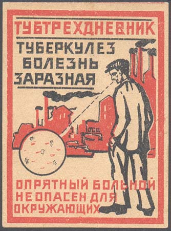 1925 1925 г. Разм. 55 х 75 мм. Двухцветная печать на толстой желтоватой бумаге. В центре в прямо-угольной рамке разм. 52 х 70 мм на фоне индустриального пейзажа больной рабочий и туберкулезные бациллы в увеличенном виде в круглой рамке. Сверху текст: «Тубтрехдневник». Ниже текст в три строки: «Туберкулез болезнь заразная». Внизу текст в три строки: «Опрятный больной не опасен для окружающих».