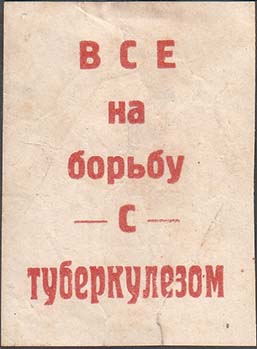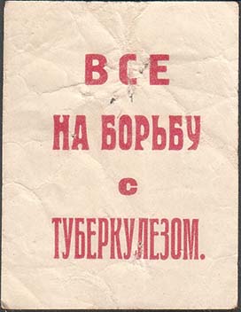 1925 1925(?) г. Разм. 44 х 57 мм. Одноцветная печать на плотной белой бумаге. В центре текст в четыре строки: «Все на борьбу с туберкулезом».