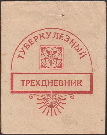 1925 1925(?) г. Разм. 58 х 74 мм. Одноцветная печать на плотной белой бумаге. В центре в прямоугольной рамке текст: «Трехдневник». Сверху декоративный элемент полукругом и текст: «Туберкулезный». Внизу декоративный элемент.