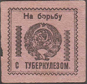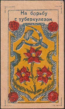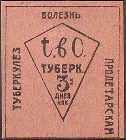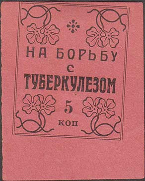 1928 1928(?) г. Разм. 50 х 60 мм. Одноцветная печать на крас-но-карминовой бумаге. В двойной прямоугольной рамке разм. 37 х 45 мм в центре текст в три строки: «На борьбу с туберкулезом». Сверху декоративный элемент. Внизу номинал в две строки: «5 коп.». По углам стилизованное изображение цветов.